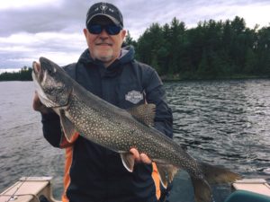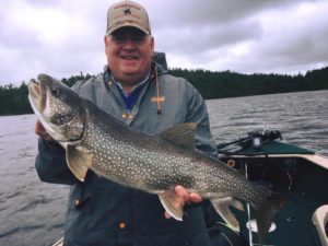 Giant 36″ Rowan Lake Lake Trout caught jigging a 5/8oz hair jig in 70 feet of water.