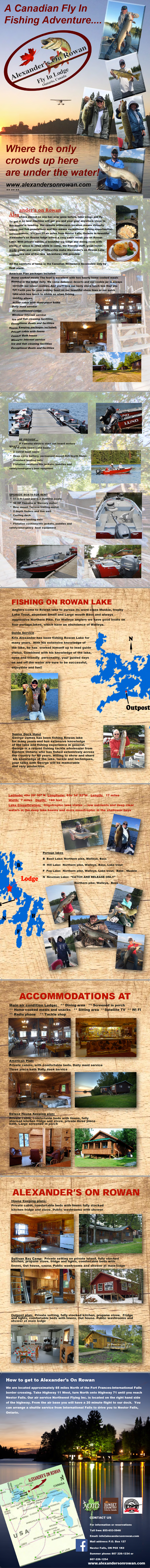 Cheryl Alexander along with her two sons Kris and Wes, own and operate Alexander's on Rowan Lake. Alexander's on Rowan is a wilderness fishing lodge located northeast of Nestor Falls, Ontario. Rowan Lake offers exceptional fishing for lake trout, walleye, largemouth bass, smallmouth bass and world-class trophy muskie.